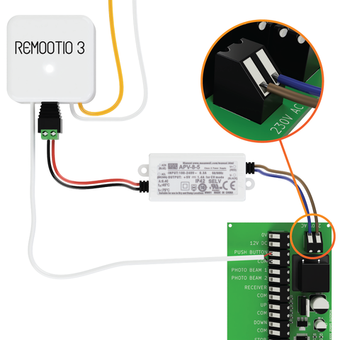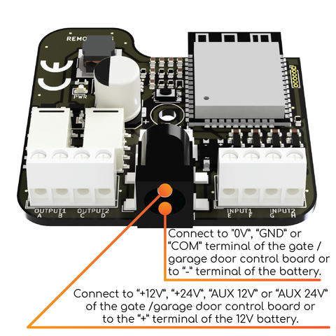 Remootio 3 has a wide operating voltage range, so you can use the dedicated terminals of your gate control board to power the Remootio 3 unit.