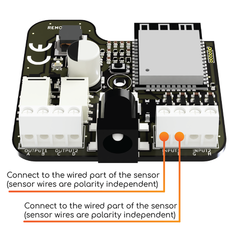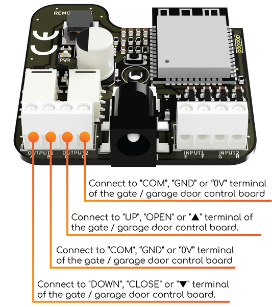 Connect the control output of the Remootio unit to the appropriate input terminals of your gate or garage door. In some cases there is only one input pair (single input) and in other cases there are two input pairs (dual input) on the control board that has to be triggered to open or close the gate or garage door.