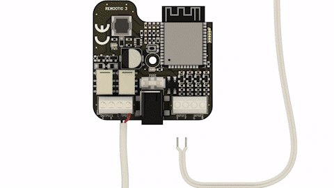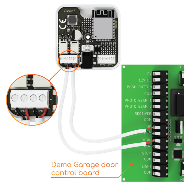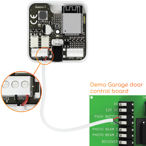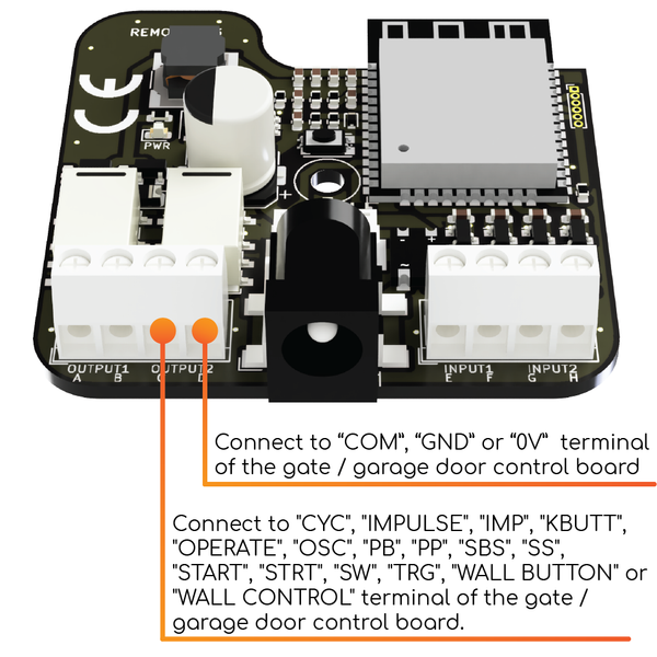 Use the included pair of wires to connect Remootio's control output to the appropriate input terminal of your garage door / gate control board. One of the leads need to be wired to the "0V", "GND" or "COM" terminal and the other lead to "CYC", "IMPULSE", "IMP", "KBUTT", "OPERATE", "OSC", "PB", "PP", "SBS", "SS", "START", "STRT", "SW", "TRG", "WALL BUTTON" or "WALL CONTROL" depending on the manufacturer's naming convention.