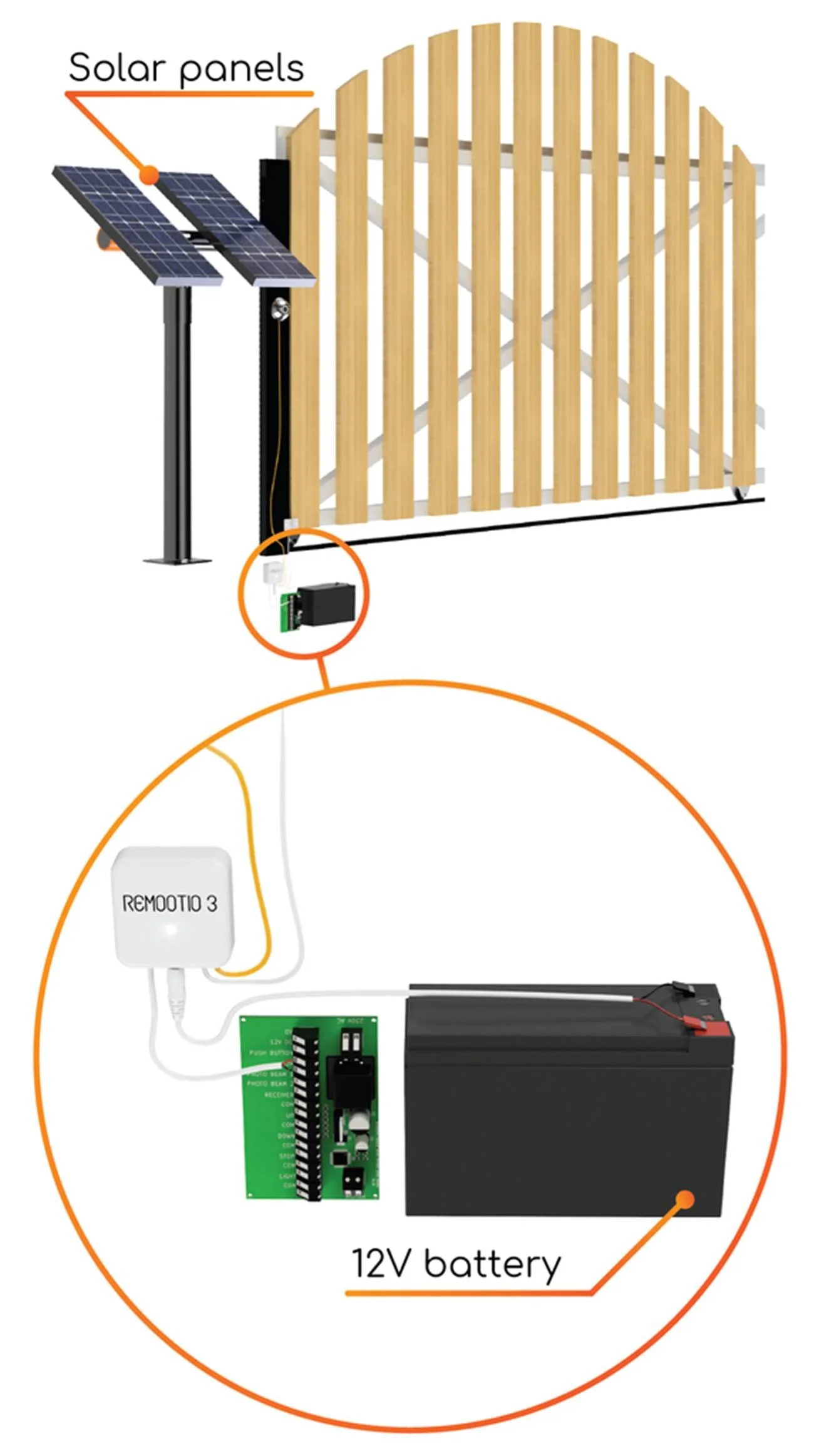 You can connect Remootio's power cord to the battery of a solar powered gate system as long as the voltage of the battery is within Remootio's operating voltage range 5-32V DC | 12-24 VAC.