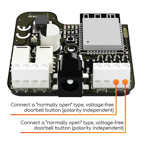 You can connect a manual control button or a doorbell button to terminal 5 of the Remootio board. (The inputs are polarity independent, which means that within the same input terminal, the order of the wires does not matter).